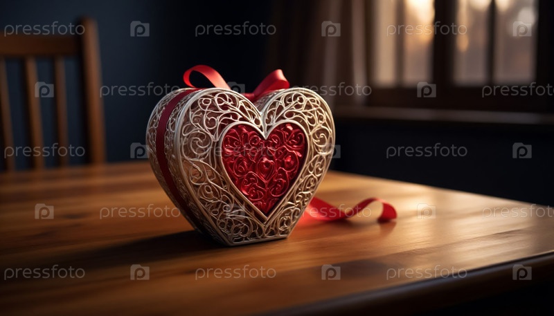 Украшенное декоративное сердце на столе, подарок на День святого Валентина, романтические каникулы