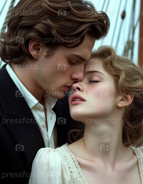 Молодой человек целует девушку на старой яхте