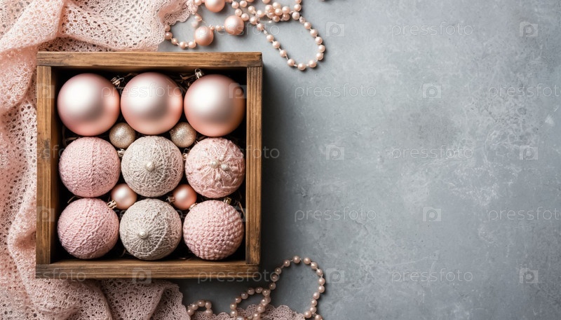 Пастельные вязаные шерстяные рождественские шары в стиле винтажного деревянного ящика. экологически чистые игрушки