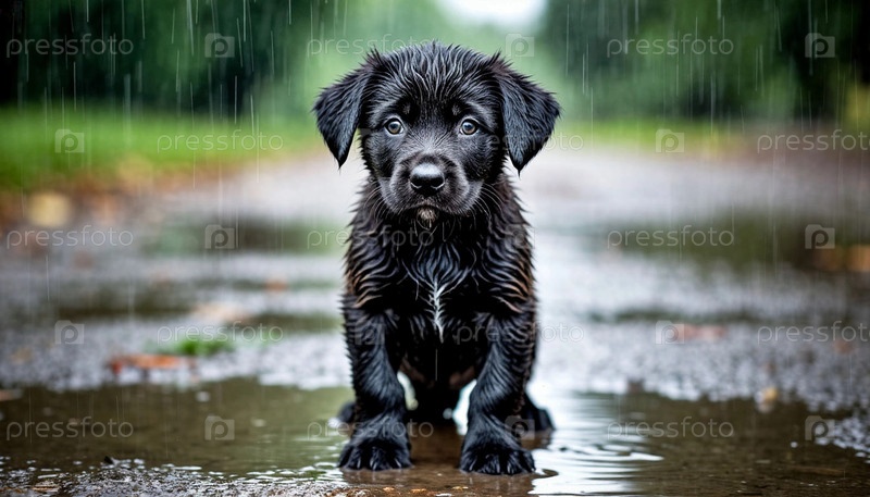 Маленький мокрый щеночек под дождем, созданный AI