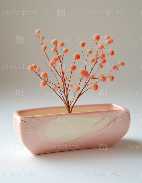 Розовая глянцевая керамическая ваза с сушеными цветами на минималистическом фоне