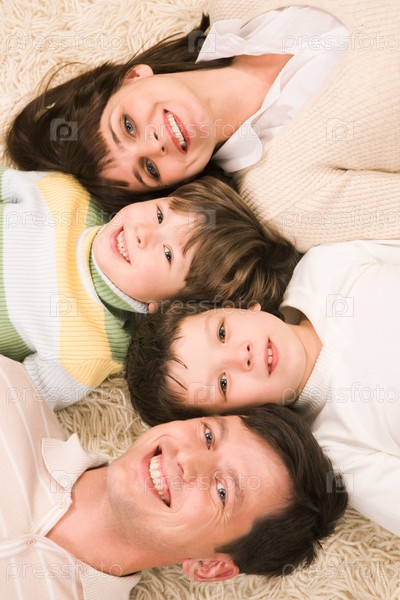 Вид сверху веселых родителей со своими двумя детьми, улыбающихся перед камерой