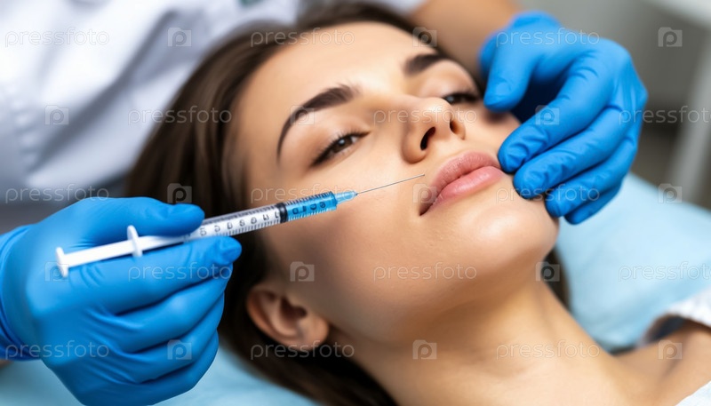 Инъекция красоты шприцем на фоне женского лица.Косметология и здоровье женщин