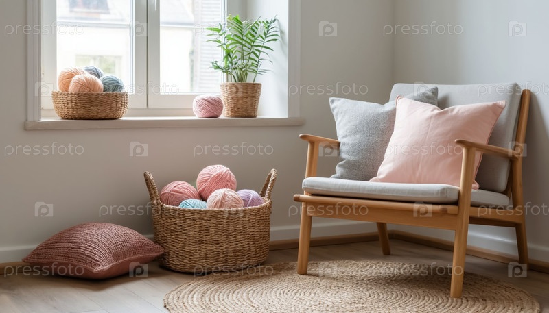 Уютный уголок ремесла в доме - стул и корзина с пряжей у окна