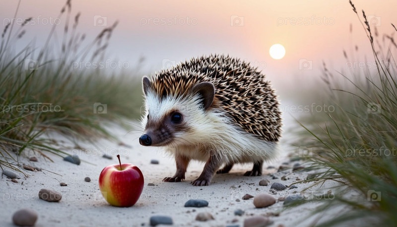 Иж с яблоком в тумане на рассвете