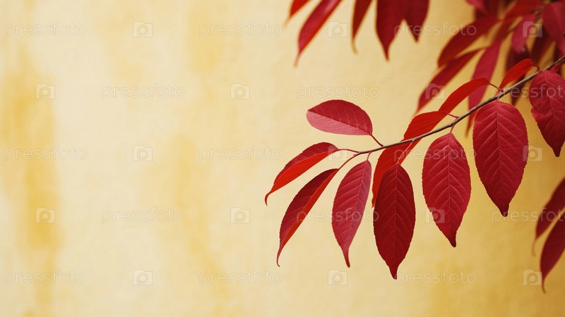 Красные листья на ветке против желтой стены, осенняя природа