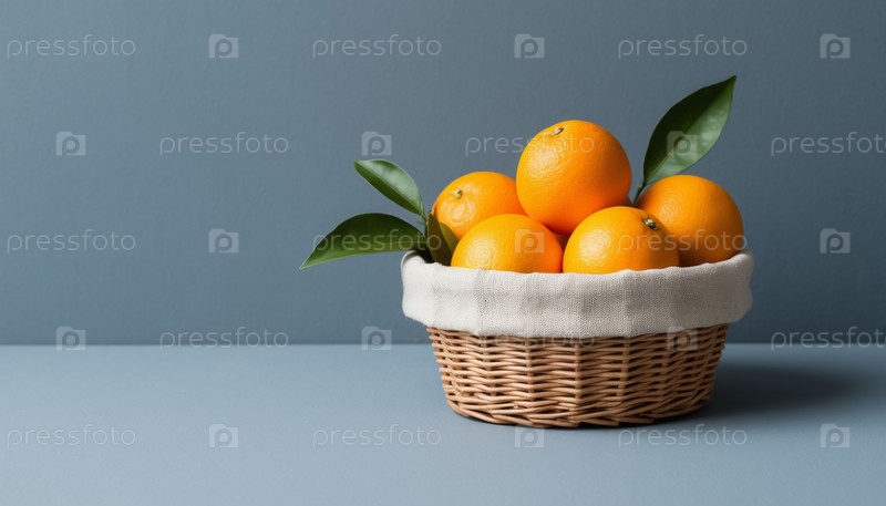 апельсины в полотном корзине на синем фоне