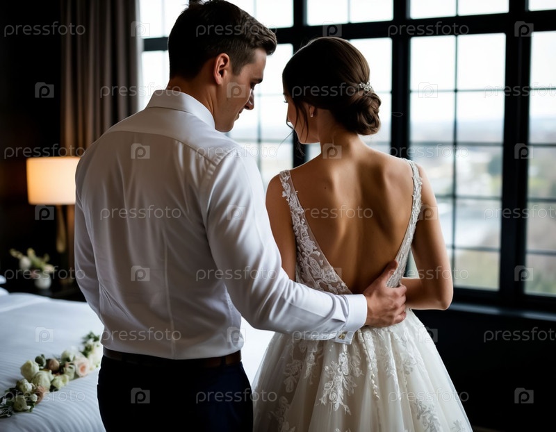 Молодожены в спальне, свадебная ночь
