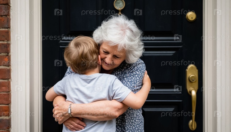 Бабушка обнимает внука на пороге