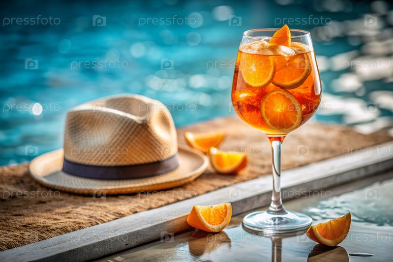 Стакан вкусного апельсинового коктейля Aperol на фоне бассейна.Алкогольный коктейль сочных фруктов с апельсином, кубиками льда и мятой