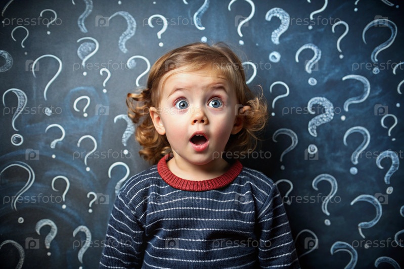 Развитие и образование детей. удивленная девочка на темном фоне с вопросительными знаками. мозговой штурм, детские вопросы и концепция идеи