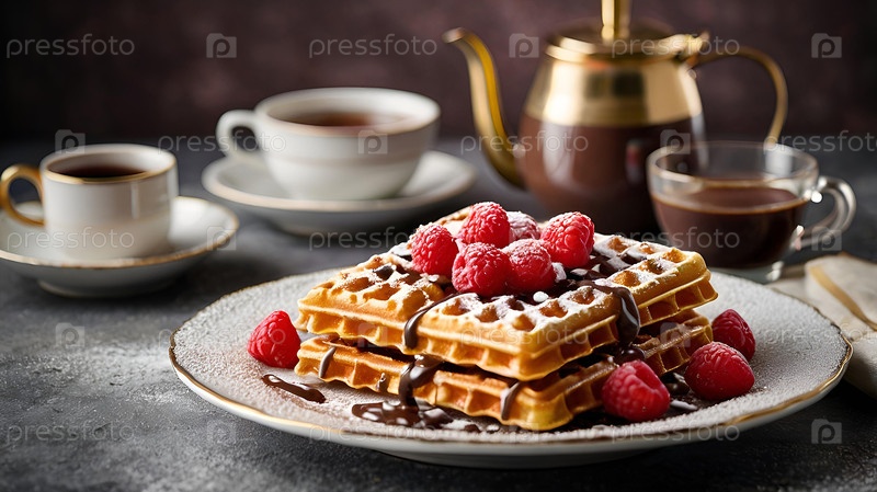 Свежевыпеченные бельгийские вафли украшены сахарным порошком, шоколадом и свежими ягодами