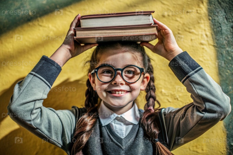 Красивая девочка с очками и книгами на голове.Ребенок впервые ходит в школу.Дети на свежем воздухе.Возвращение к школе