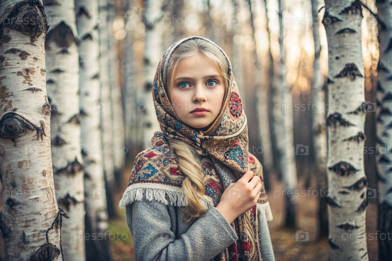 Красивая девушка в традиционном русском народном шале в весенней березовой роще.Портрет символизирует традиции и красоту русского народа