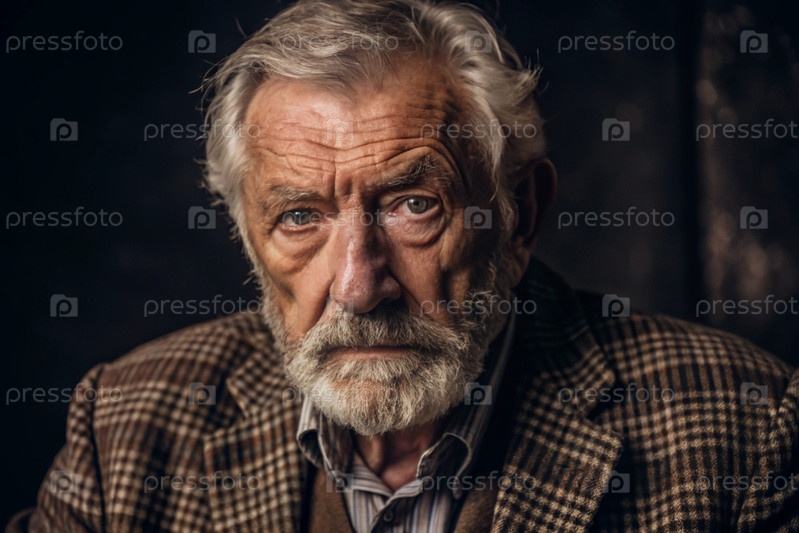 Студийный портрет стильного, элегантного пожилого мужчины в возрасте 70 лет, одетого в квадратную куртку в коричневых тонах