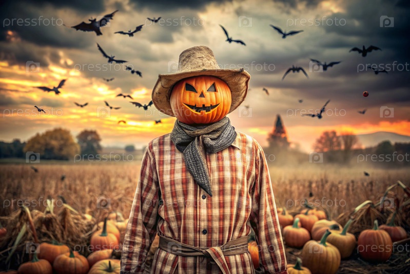 Концепция Хэллоуина. Ужасная. Страх. Устрашающий богий с тыквенной головой, квадратной рубашкой и бабочкой. Баннер, открытка