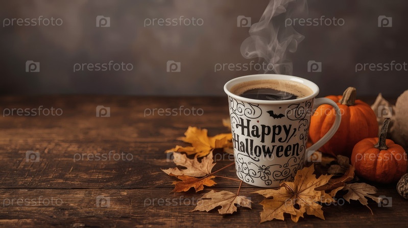 Хэллоуин. тыква, осенние листья и чашка кофе на столе. вид сверху, деревянная поверхность