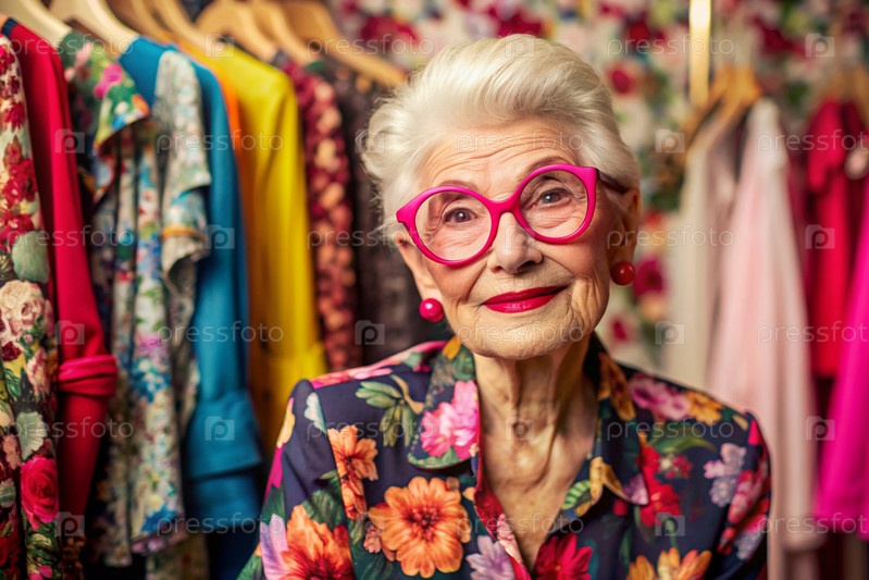 Портрет стильной, модной пожилой женщины, пенсионерки 70 лет, которая носит очки и одежду с цветочными оттисками
