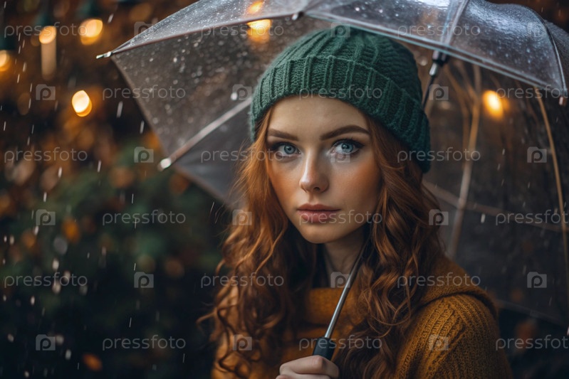 Осенний портрет под дождем. Близкий план молодой рыжеволосой женщины с ярко выраженными зелеными глазами в вязанной шляпе под зонтиком