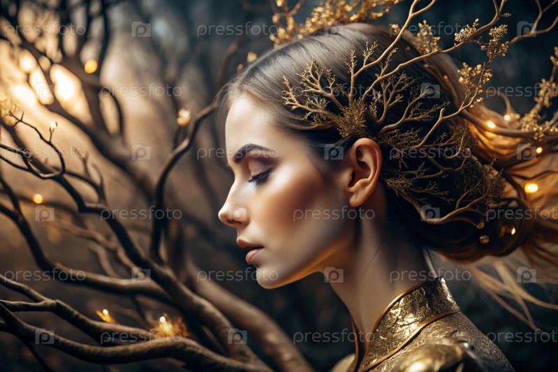 Творческий баннер для салона красоты в черно-золотом цвете. Красивая женщина, окруженная лесом с макияжем и волосами. Золотые ветви дерева в волосах. Индустрия красоты