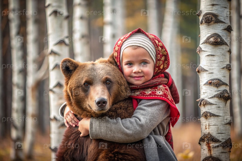 Красивая маленькая девочка в русской народной одежде и с платками на голове в березовой роще с живым медведем Русский фольклор, славянская мифология