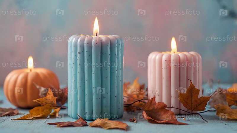 Пастельный розовый и синий тыквенные цвета, светло-синие и розовые свечи и осенние листья на светлом фоне