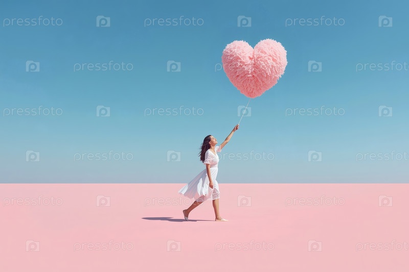 День святого Валентина.Сюрреалистическая сцена.Девушка в белом платье, дрожащая на ветре, гуляющая по розовому пространству под голубым небом.Она держит большое пушистое розовое сердце, плавающее над землей