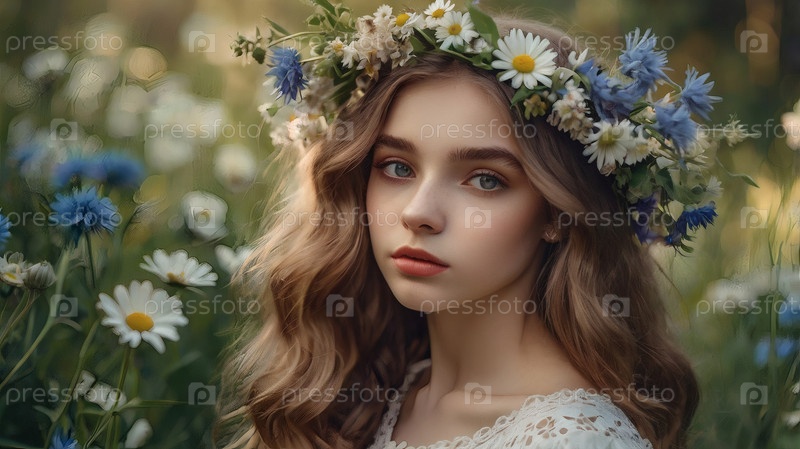 Красивая девушка с венком ромашки и кукурузных цветов на голове в поле. День святого Петра и Февронии. Всероссийский день семьи, любви, верности