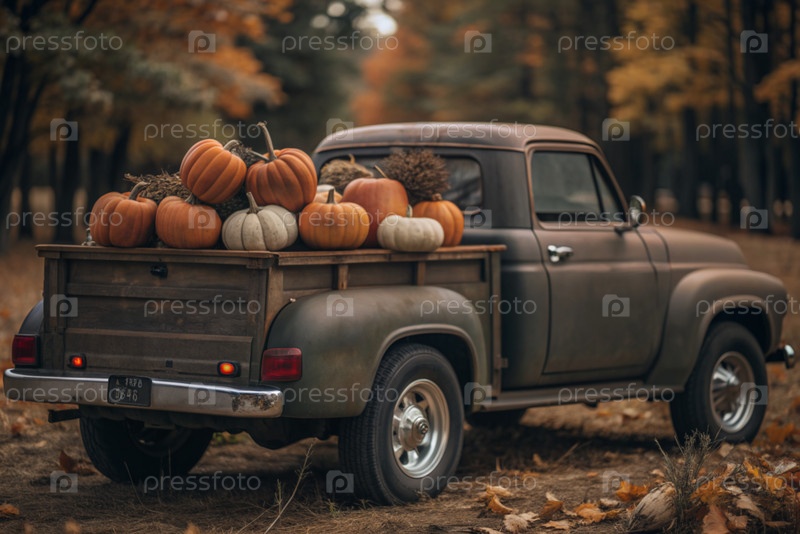 Осень, осенний дизайн.Большой урожай тыквы на заднем сиденье ретро-пикапа, крупный план