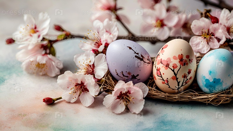 Нежные пасхальные яйца и вишневые ветви цветут на пастельном акварельном фоне с нежными полосками