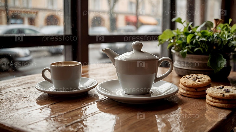 Белая чашка горячего кофе и печенье на столе в современном уютном кафе у окна. снаружи идет дождь. понятие комфорта и тепла