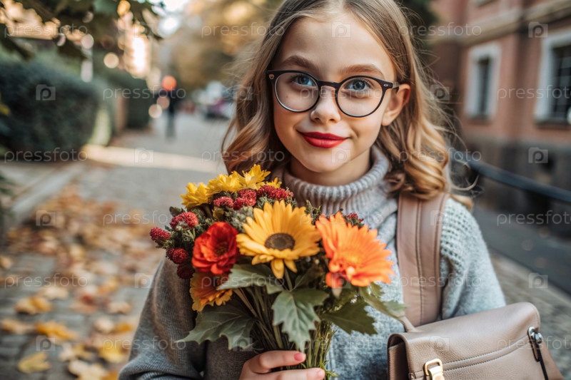 Красивая девушка с очками и букетом осенних цветов идет в школу. ребенок со школьной сумкой, книгой и цветами. младенец на городской улице. обратно в школу