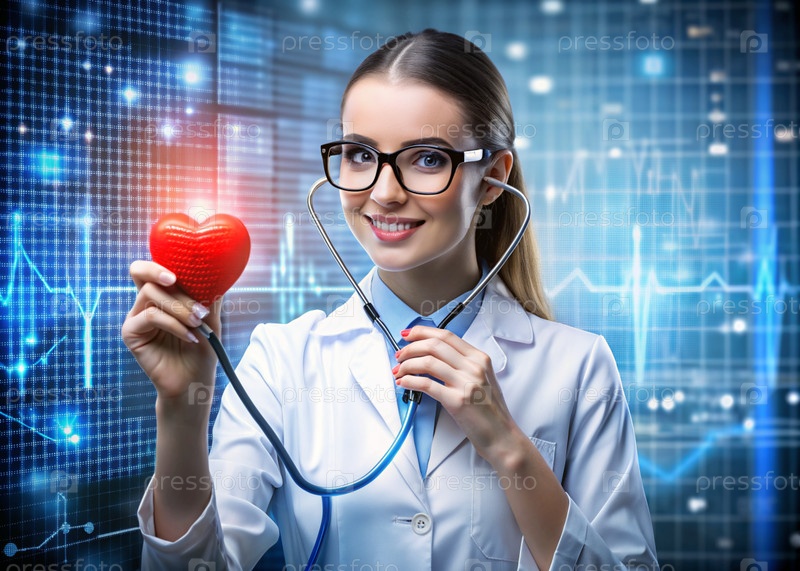 Медициной молодой красивой девушки является кардиолог с очками в кабинете со стетоскопом.Красные цифровые коды в виде частоты сердечных сокращений на виртуальном экране.Цифровые технологии будущего