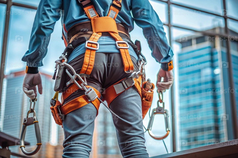 Мужчина-строитель в защитном снаряжении, ремнях безопасности и с крючками для ремней безопасности для работы на большой высоте