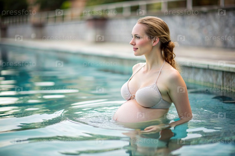 Расслабление, душевное спокойствие. Беременная красивая женщина в отопительном бассейне на открытом воздухе. Понятие беременности, родов и родительства. Здоровый образ жизни