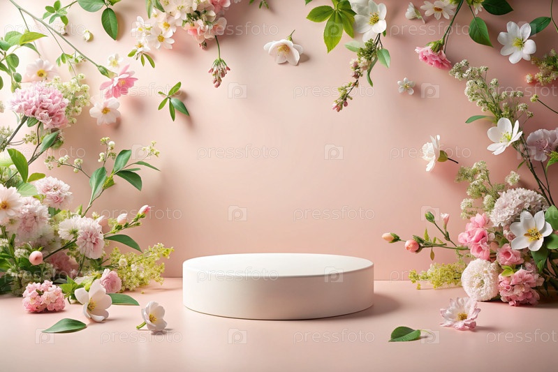 Минималистский розовый пастельный фон для демонстрации продукта.Современная подиум с розовой стеной и цветами вокруг.Креативный дизайн презентации продукции