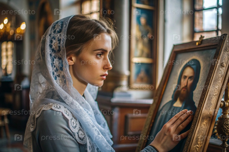 Портрет красивой молодой женщины с платками в православной церкви.Девушка молится в церкви среди икон
