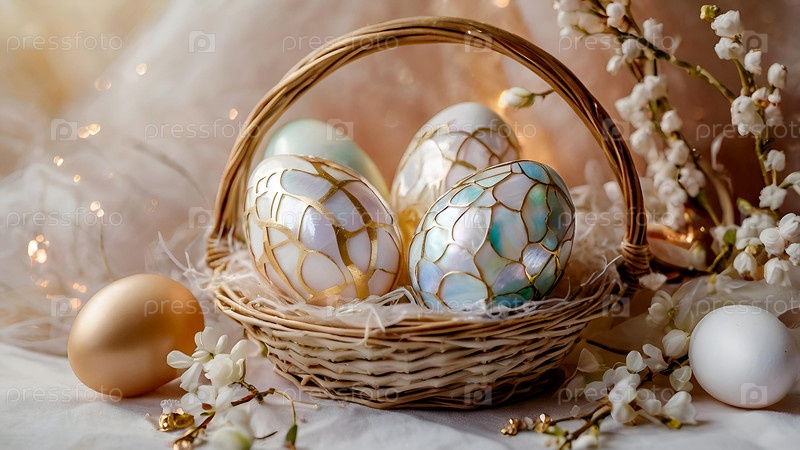 Нежные пасхальные яйца в жемчужной корзине и нежные цветы на пастельно-водном фоне