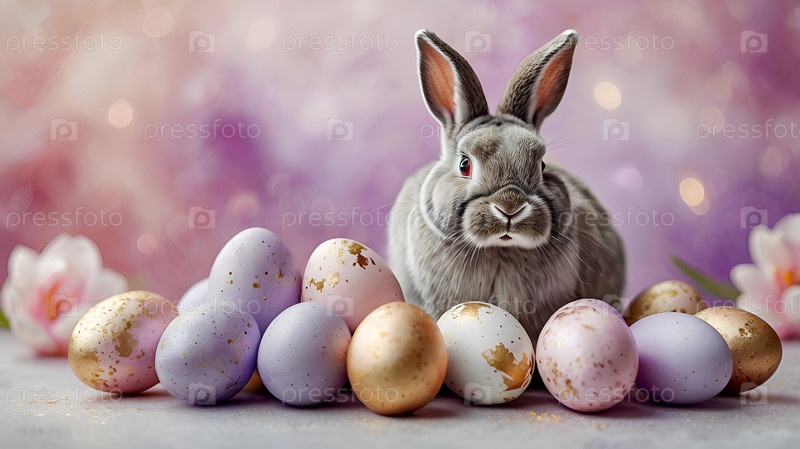 Нежные пасхальные яйца, серый кролик и цветы тюльпанов на пастельном акварельном фоне с нежными венами