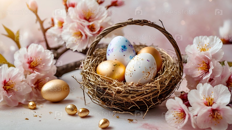 Нежные пасхальные яйца и вишневые ветви цветут на пастельном акварельном фоне с нежными полосками