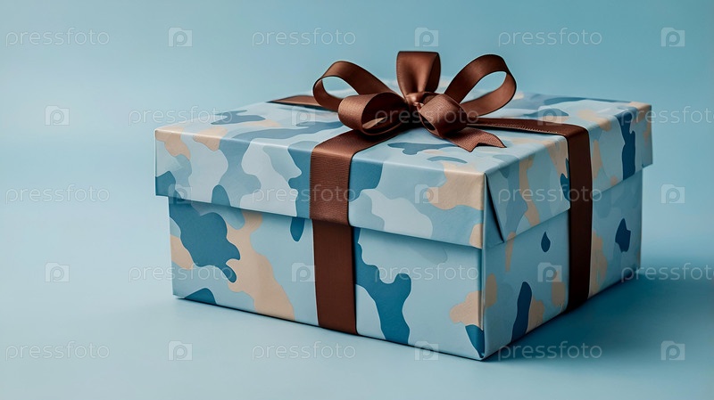 Концепция Дня защитника Отечества 23 февраля.Подарочная камуфляжная коробка с праздничной сатинной лентой луков на светло-синем фоне