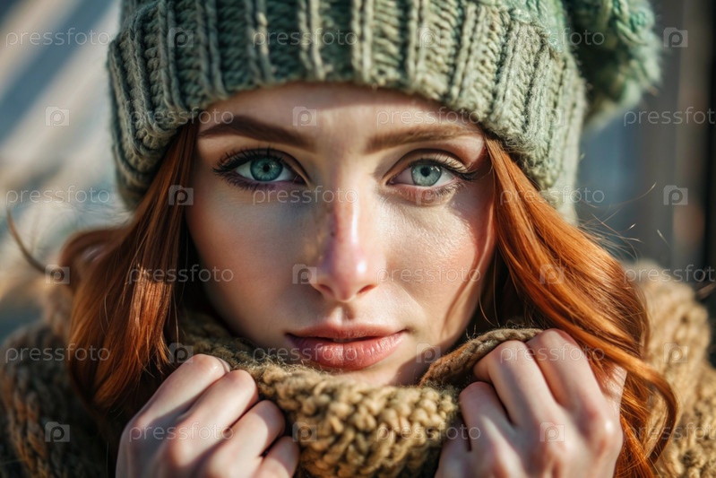 Осенний портрет. Близкий план молодой рыжеволосой женщины с выразительными зелеными глазами в вязанной шляпе и свитере