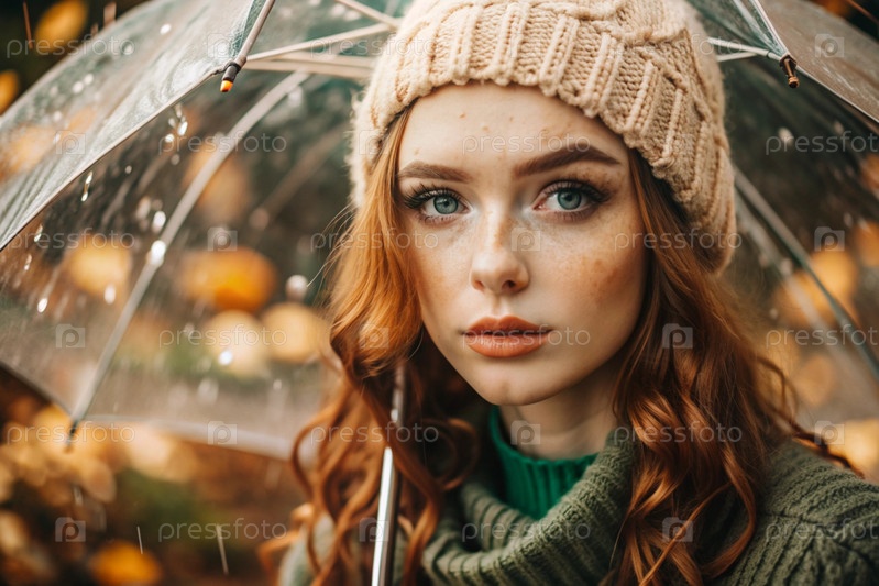 Осенний портрет под дождем. Близкий план молодой рыжеволосой женщины с ярко выраженными зелеными глазами в вязанной шляпе под зонтиком