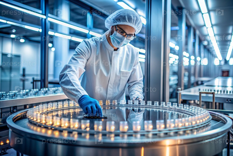 Производство лекарств: фармацевт тестирует медицинские флаконы на автоматическом трубопроводе фармацевтической производственной линии с использованием искусственного интеллекта