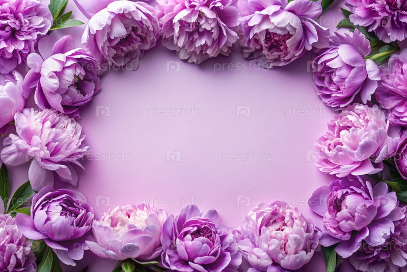 Рама с красивыми цветками пиони на пастельно-фиолетовом фоне