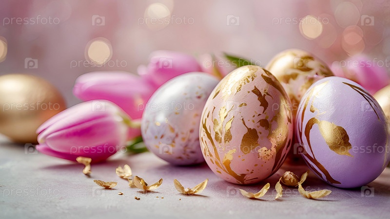 Нежные пасхальные яйца в розовых, золотых и фиолетовых тонах и цветы тюльпанов на пастельном акварельном фоне с деликатными венами