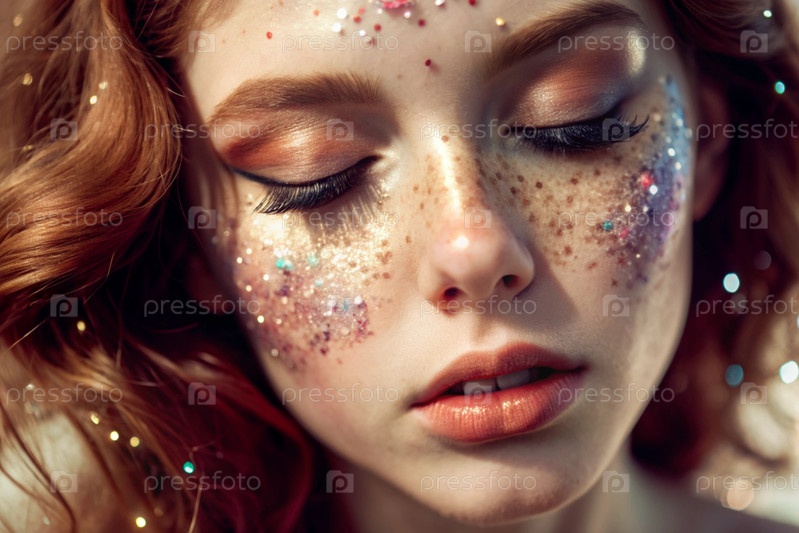 Покрытие лица девушки праздничным макияжем и ленточками.Изображение придает ей сказочный и мистический вид.Концепция новогодней ночи или дня рождения