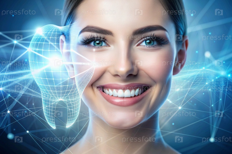 Новые технологии в протезировании зубов. Имплантаты. Улыбающаяся женщина со здоровой, идеальной улыбкой. Концепция стоматологического здоровья и ухода за зубами