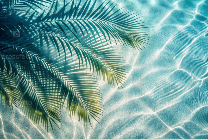 Концепция летнего отдыха на пляже. Вид тропических листьев на поверхности воды. Тень пальмовых листьев на белом песчаном пляже. Красивый абстрактный фон для баннера