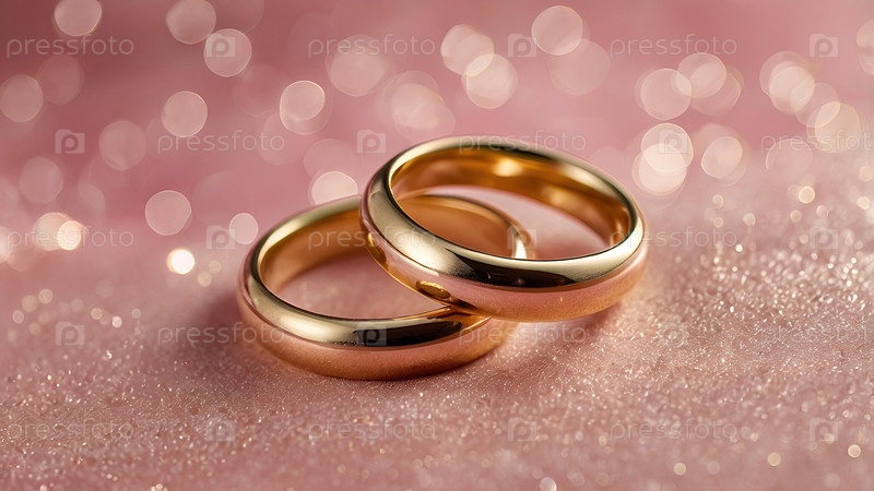Золотые обручальные кольца на розовом фоне со стороной